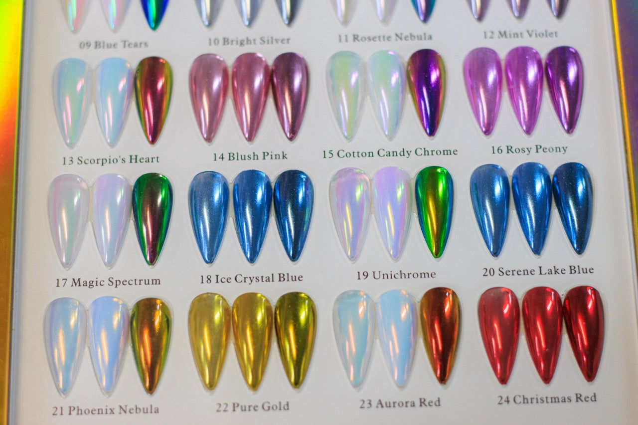 From soft pearlescent tones to bold metallic finishes, this collection allows nail artists to achieve endless chrome looks with professional-quality results.